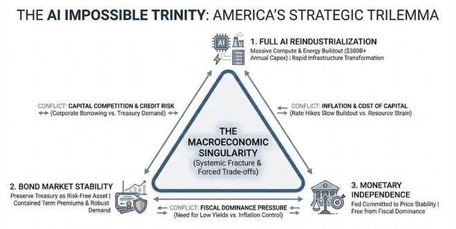 美国已经进入了一个只能被描述为宏观经济奇点—a碰撞点,人工智能基础设施建设的资本、能源和制度要求已经粉碎了物质世界和金融世界的有限能力。这次碰撞的中心坐落着我所说的 AI的不可能三位一体:美国试图同时实现的三个战略目标,尽管它们存在根本性的相互排斥。